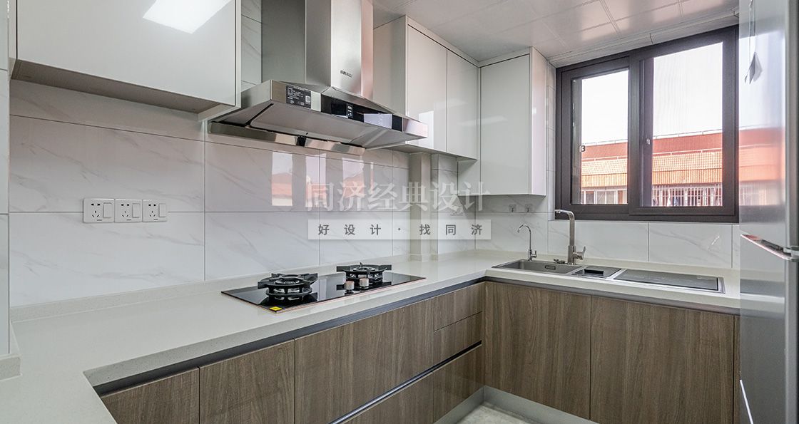 在进门处增加了鞋柜,玄关地面做了瓷砖好打理,同时空间上做了区分。客厅做了整面的电视柜兼具储物和展示功能,厨房做了重新规划,增加了橱柜的操作台面。客卫做了调整后,里面放了洗衣机烘干机,同时还有一个挂墙式小洗衣机。书房做了多功能的储物,书桌和沙发床兼具客房的功能。主卧的门位置做了调整,原进门位置做了衣帽间