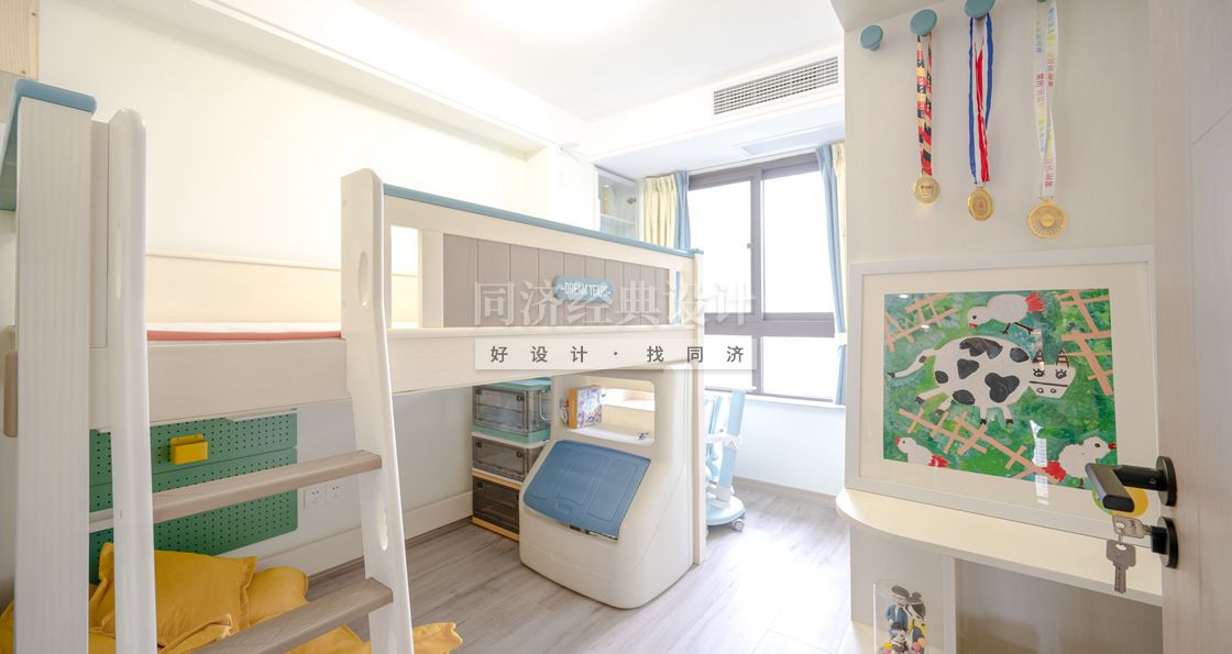 设计师将原本窄短的鞋柜根据格局比例设计了一整面入户柜,贴心的做了换鞋凳,悬空式换鞋区还做了感应灯,让仪式感从入户的那一刻就体现的淋漓尽致。设计师还特意选择了牛油果绿色搭配了洞洞板置物架让整个空间显得更有活力感。原本昏暗老气的地砖亮面地砖也换成了暖色系柔光面的大面砖,去除了繁琐的线条感,让整个客餐厅显温馨更明亮。儿童房做了高低铺床的设计,充满童趣的格局也划分了学习区和儿童阅读娱乐区的功能,大大的磁力板让孩子也有了更多的学习乐趣。客餐厅的酒杯字母灯让两个空间有了整体的联动性,绿色的边几也和玄关处有了一个延伸的色彩搭配。厨房的设计也大大提升了操作台和电器的储物需求;卫生间的干湿分离有人让全家人的生活变得更便利,淋浴房的宽度也重新做了调整,让给孩子洗澡的时光变得更加的舒适和惬意;主卧的家具是之前结婚时买的,非常之有意义,为了能更好的保留下来,设计师也单独搭配了融合整个空间风格的软装饰品和家具,让卧室变的更具独特性。原本的书房空间被打造成了衣帽间,满足了业主对储物需求的满足。阳台的功能也做了整体的洗晒区域,巧妙的容纳了洗烘衣机之外还能有一个超大的洗涤台盆,让做家务变的更得心应手。