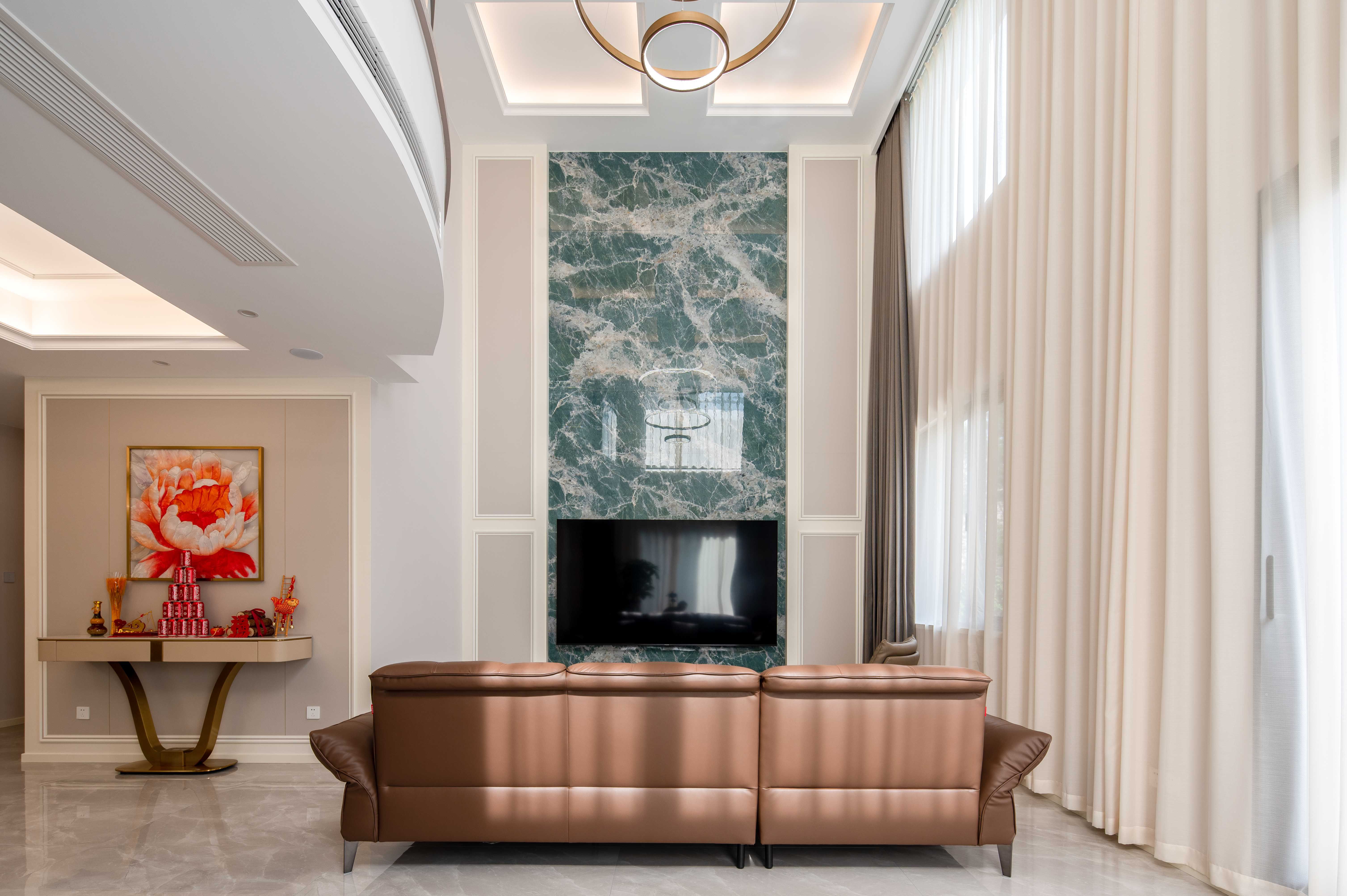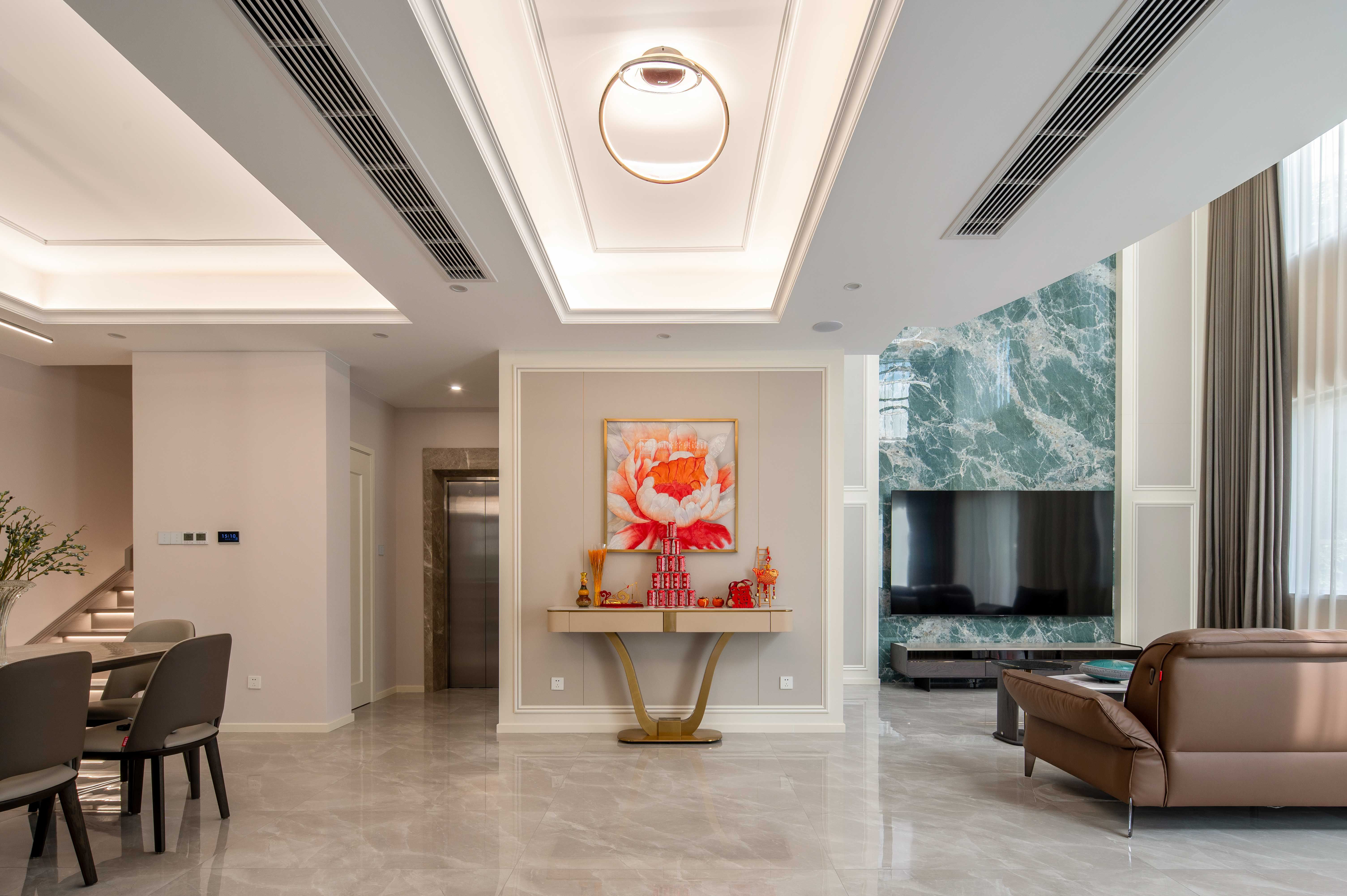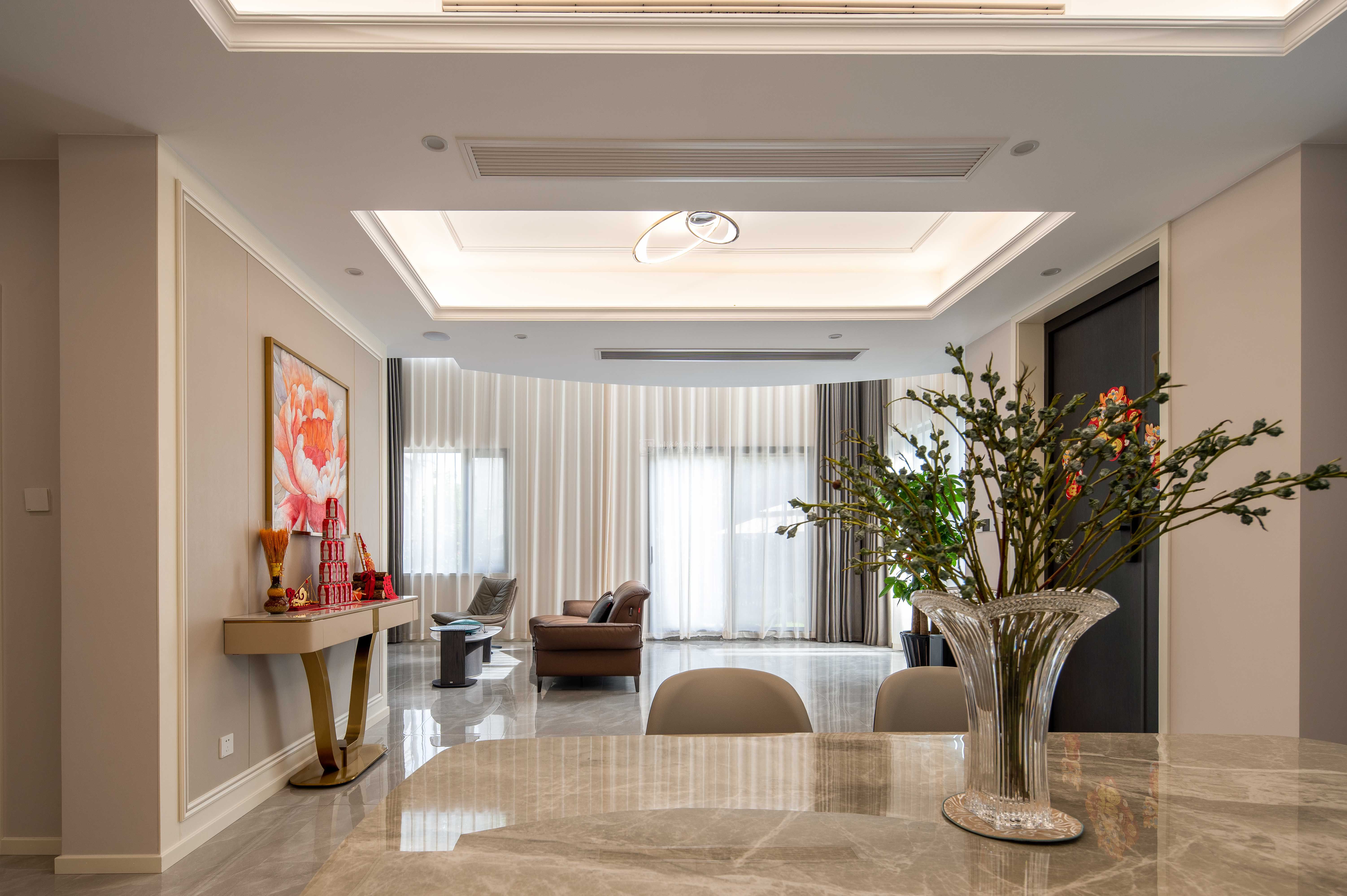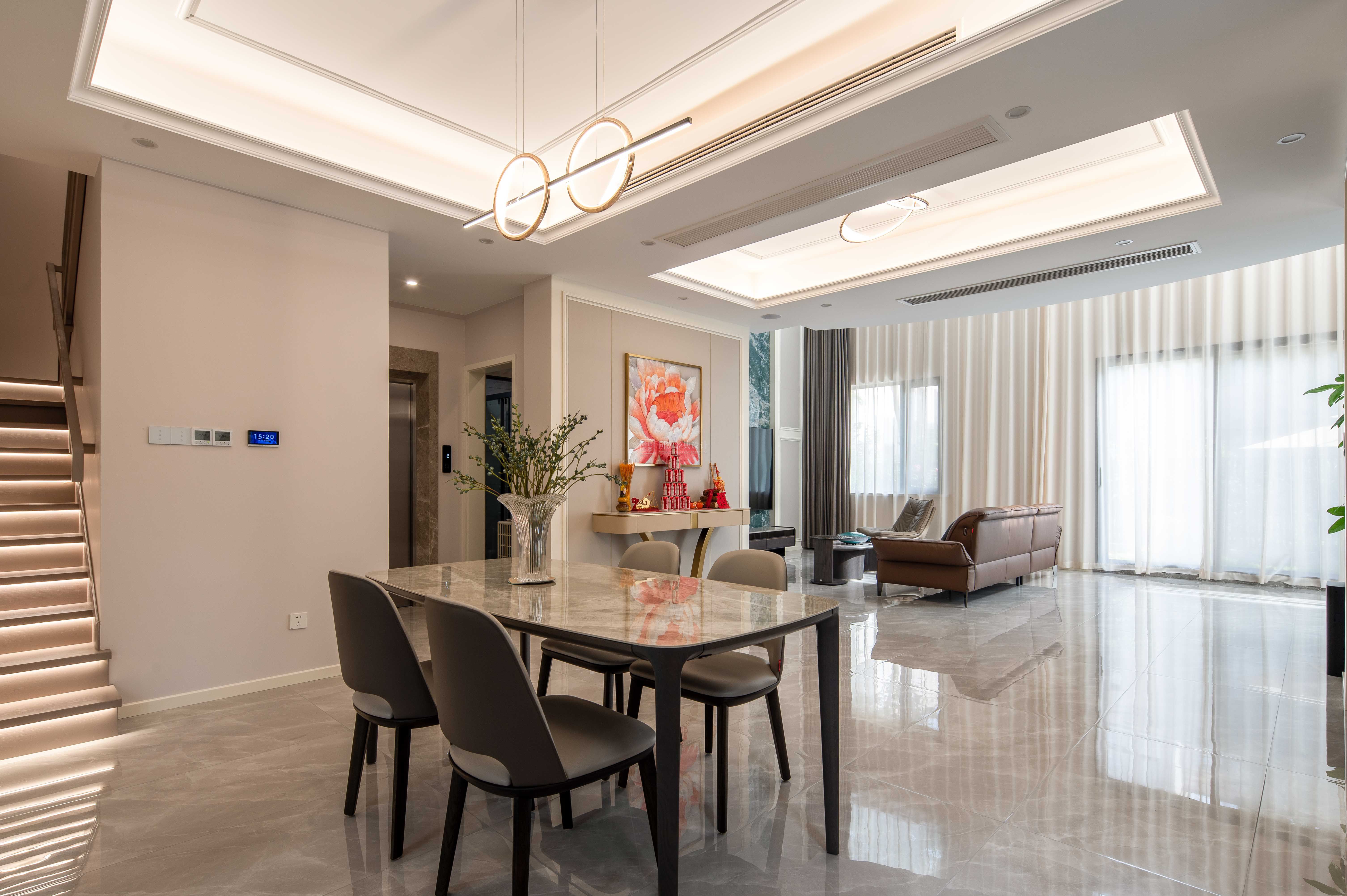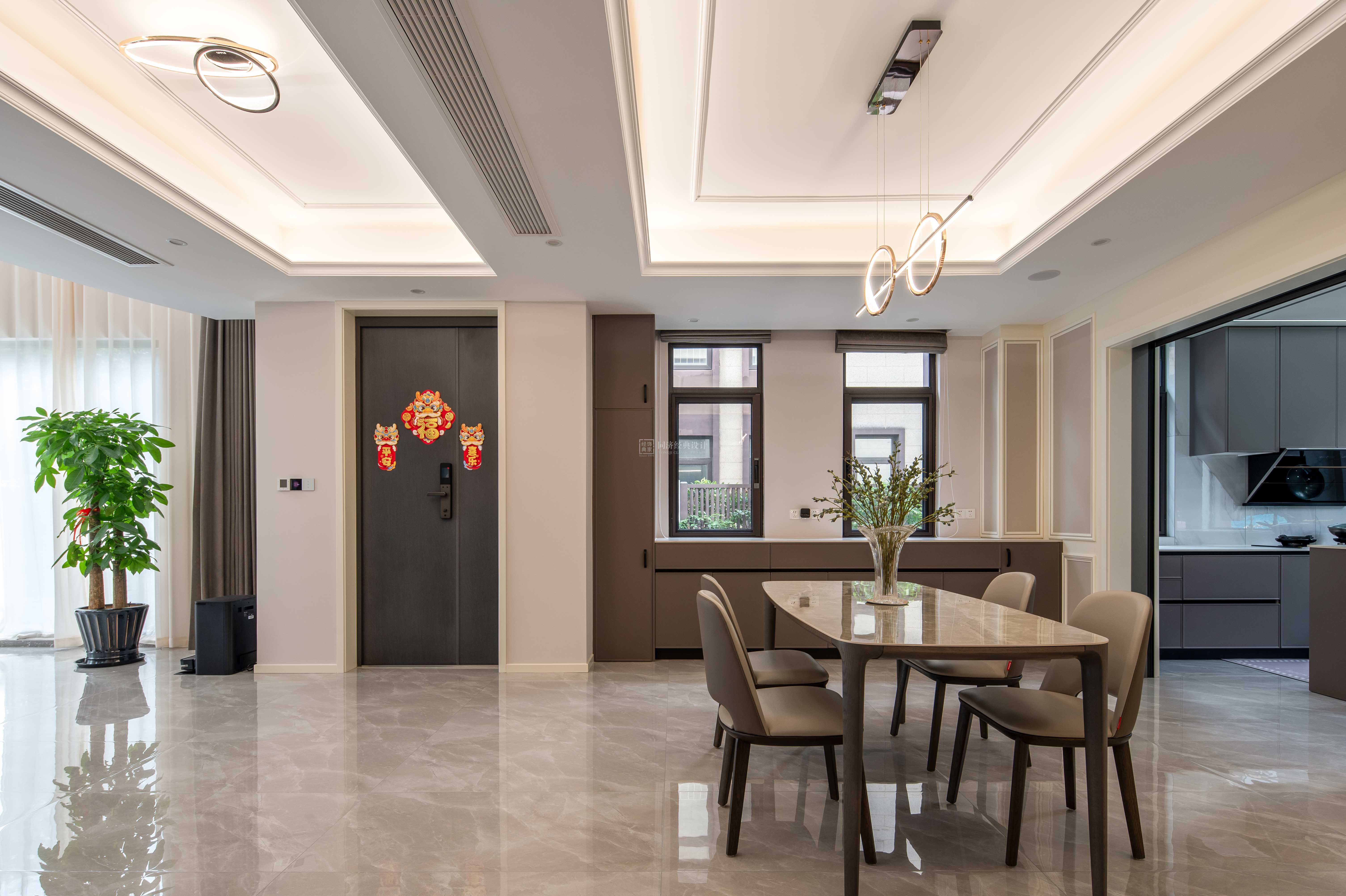 本案业主为一对夫妻两个人养老度假居住的地方,女儿、女婿、外甥女偶尔来住,过年过节亲朋好友聚会。在设计风格上,业主偏好现代简约风格,在设计时充分考虑了他们的喜好和需求,经过的精心设计后完善了空间布局,增大了室内空间,使得空间更为合理。 同时,设计师在设计的时候也注重空间的开放性和流畅性,采用了开放式的布局,让客厅、餐厅和厨房相互连通,营造出宽敞明亮的空间氛围。